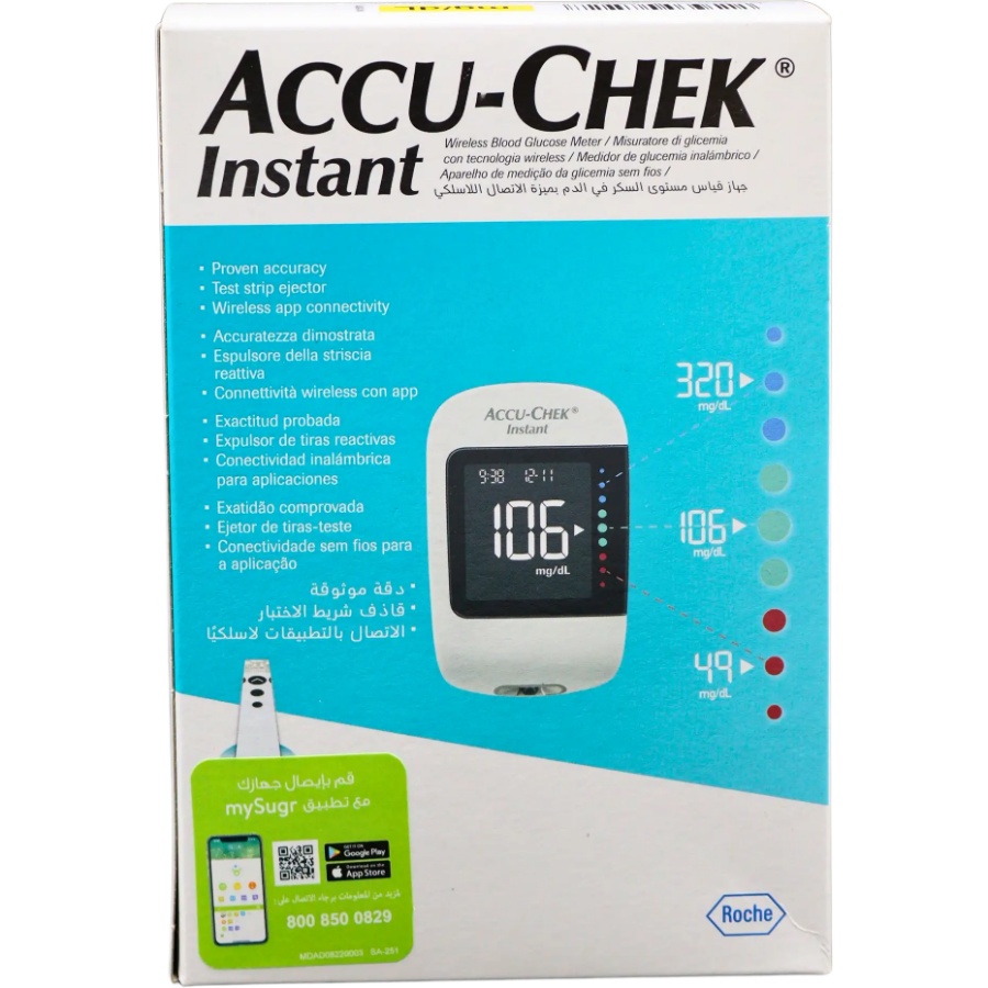 يعد Accu-Chek Instant جهاز قياس سكر في الدم سهل الاستخدام، يتميز بشاشة كبيرة لعرض النتائج بوضوح، مع نظام ترميز تلقائي لتقليل الأخطاء. يوفر قراءة دقيقة لمستوى الجلوكوز في الدم خلال ثوانٍ، مع إمكانية تخزين البيانات لمتابعة القياسات بمرور الوقت. متوافق مع شرائط Accu-Chek Instant Strips، وهو مثالي للاستخدام المنزلي لمراقبة مرض السكري بسهولة وفعالية.