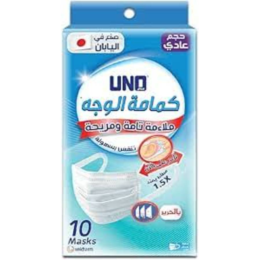 قناع وجه (كمامة) UNO PLUS مقاس عادي (REGULAR)، العبوة تحتوي على 10 قطع (معبأة في مجموعتين 10x10)، رقم الموديل 0138.\nيستخدم للمساعدة في حماية الجهاز التنفسي من الغبار والرذاذ.\nمناسب للاستخدام اليومي لتوفير حاجز وقائي.