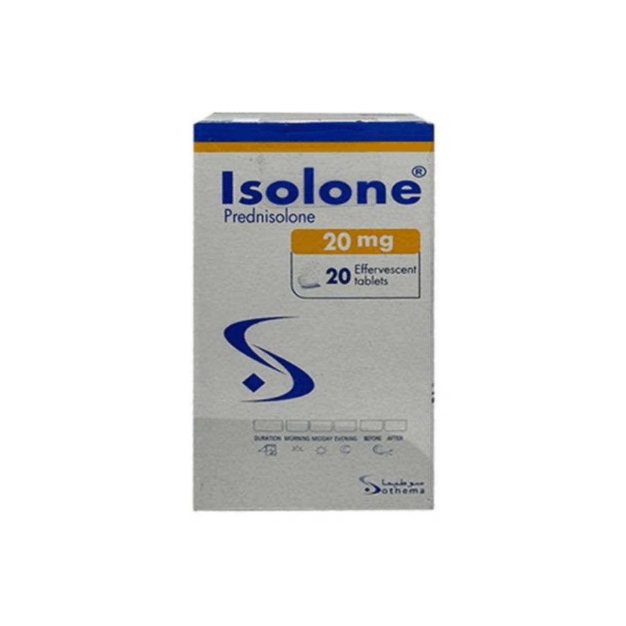 إيزولون 20 ملجم هو دواء يأتي في شكل أقراص فوارة. تحتوي العبوة على 20 قرصاً بتركيز 20 ملجم.