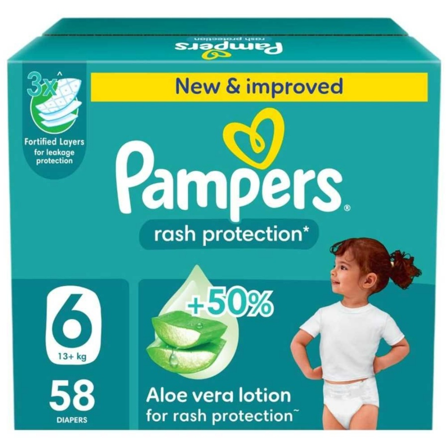الوصف: بامبرز مقاس 6، مناسبة للأطفال بوزن 14+ كجم. العبوة تحتوي على 58 حفاضة. المزايا: ناعمة على بشرة الطفل. توفر حماية من التسربات. تحتوي على مؤشر رطوبة لتسهيل معرفة وقت التغيير. طريقة الاستخدام: ضعي الحفاضة بحيث تكون الأشرطة اللاصقة في الأمام، ثم ثبتيها بشكل مريح.