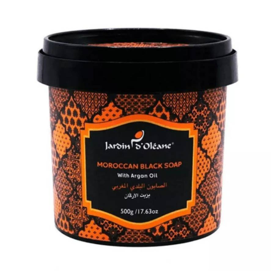 صابون مغربي أسود من جاردن دي أوليان بزيت الأرغان في عبوة كبيرة بوزن 500 جرام.