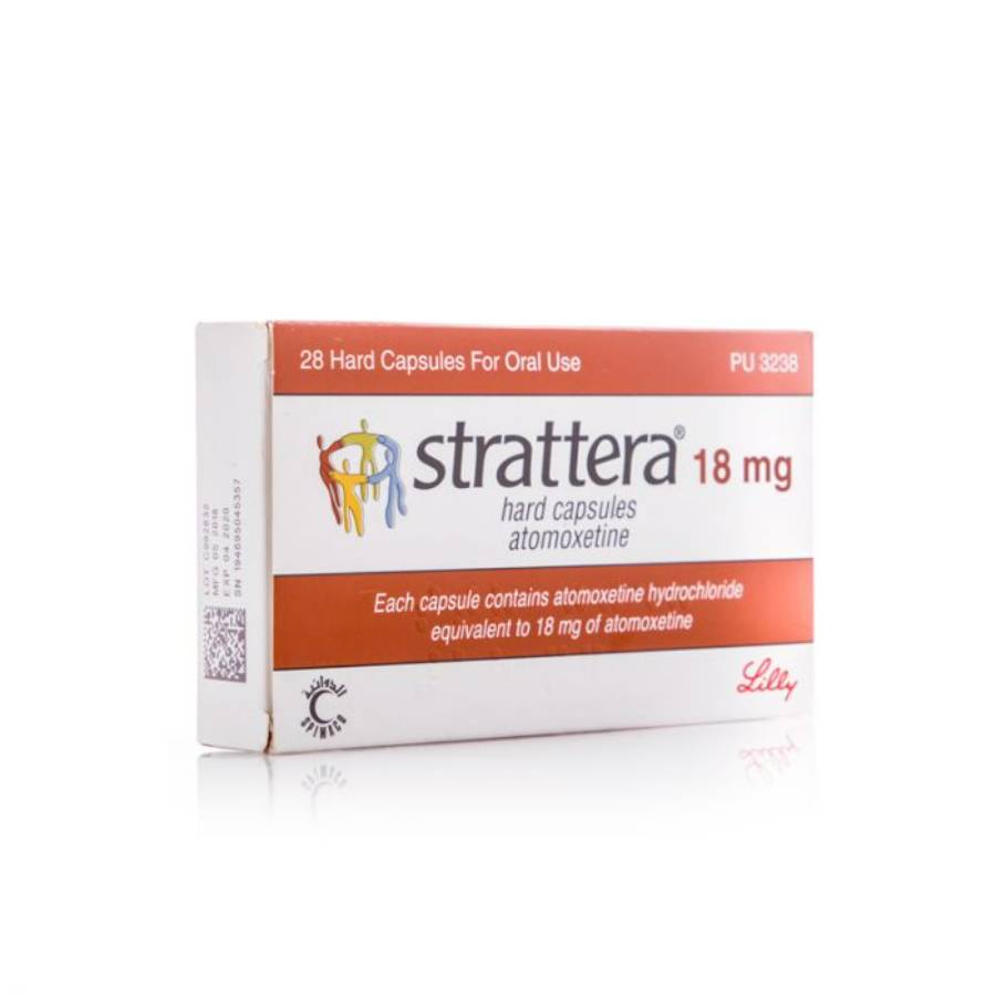 دواء STRATTERA بتركيز 18 ملغ، عبوة تحتوي على 28 كبسولة. يُستخدم لعلاج اضطراب فرط الحركة ونقص الانتباه (ADHD). يعمل عن طريق التأثير على مواد كيميائية معينة في الدماغ. يتطلب وصفة طبية وإشرافًا دقيقًا.