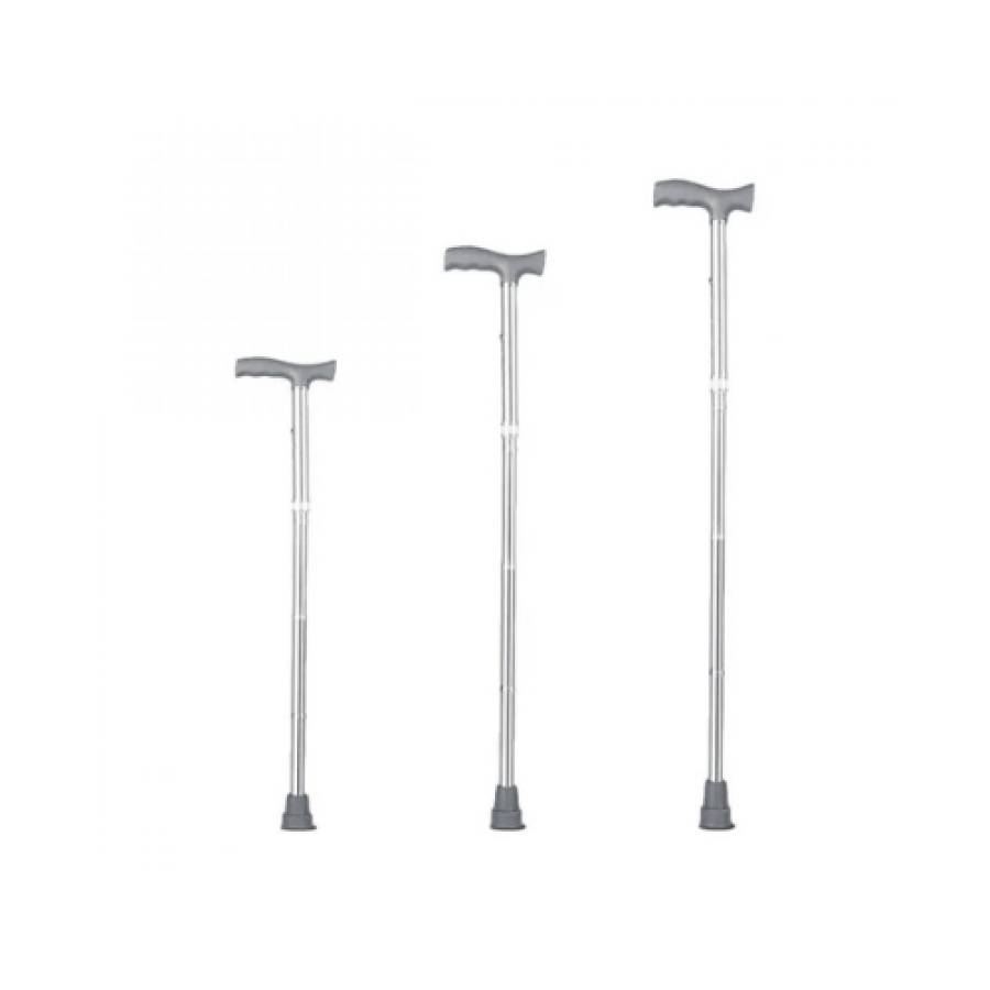 عصا مشي معدنية مكونة من جزئين، باللون الفضي.\nيمكن طيها أو تفكيكها لسهولة النقل والتخزين في حقيبة.\nتستخدم لتوفير الاستقرار والدعم للأشخاص الذين يحتاجون مساعدة في المشي.