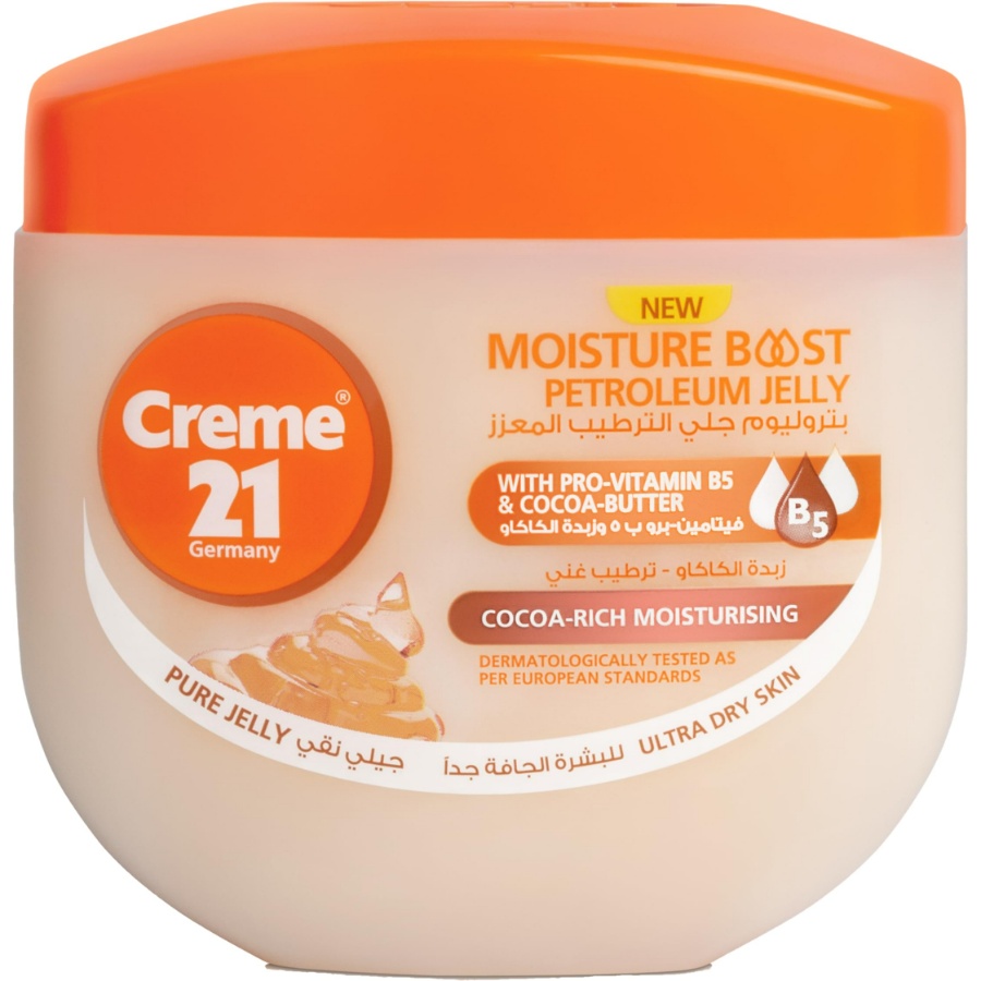 كريم 21 جيلي بتروليوم بالكاكاو هو منتج مرطب مصمم لتوفير ترطيب عميق وطويل الأمد للبشرة الجافة. يحتوي على زبدة الكاكاو التي تغذي البشرة بعمق وتعيد حيويتها، بالإضافة إلى بروفيتامين B5 الذي يساعد في تعزيز صحة البشرة وحمايتها من الجفاف. يُكوّن طبقة رقيقة على سطح البشرة تحافظ على الترطيب وتحميها من العوامل الضارة، مما يقلل من الجفاف والتقشر. يُنصح باستخدامه بانتظام للحصول على بشرة ناعمة ومظهر صحي.