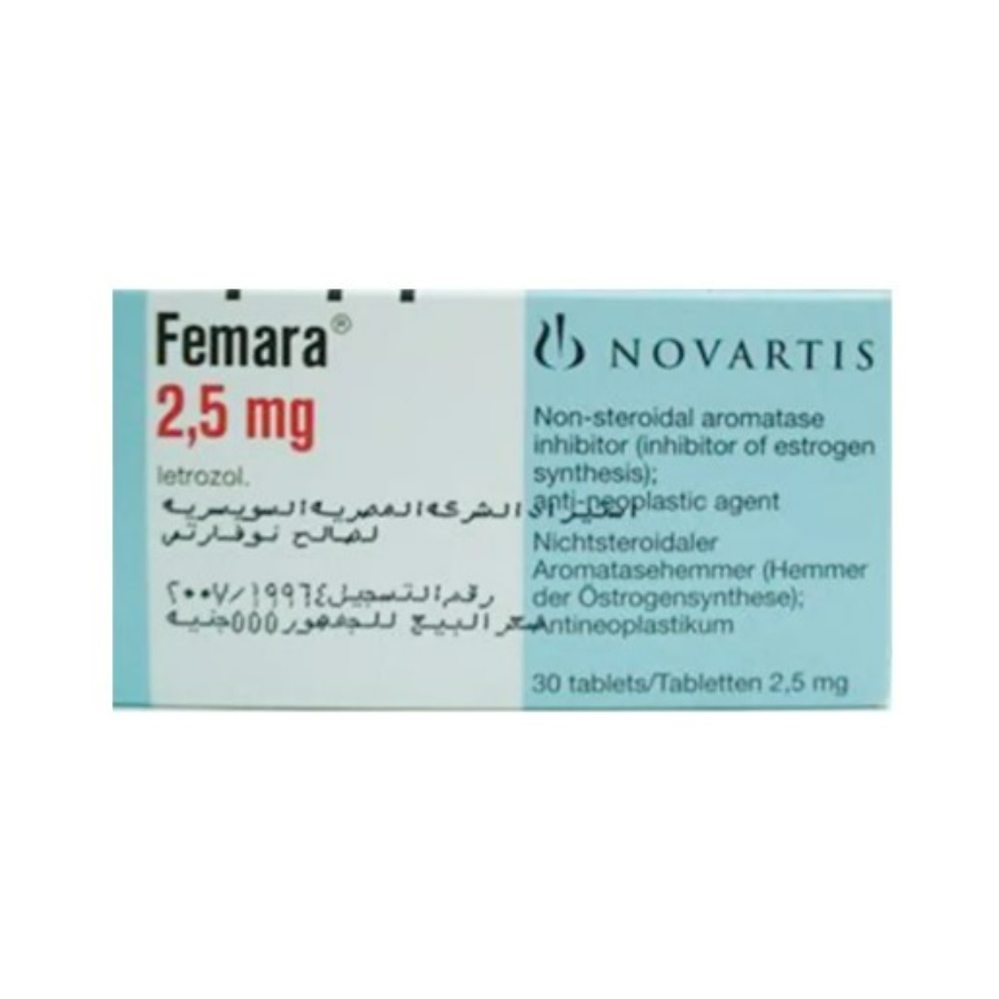 أقراص Femara بتركيز 2.5 ملغ، تأتي في عبوة تحتوي على 30 قرص. هذا الدواء يستخدم في علاج أنواع معينة من سرطان الثدي لدى النساء بعد انقطاع الطمث. يعمل على تقليل مستوى الإستروجين في الجسم للمساعدة في إبطاء أو إيقاف نمو الخلايا السرطانية.