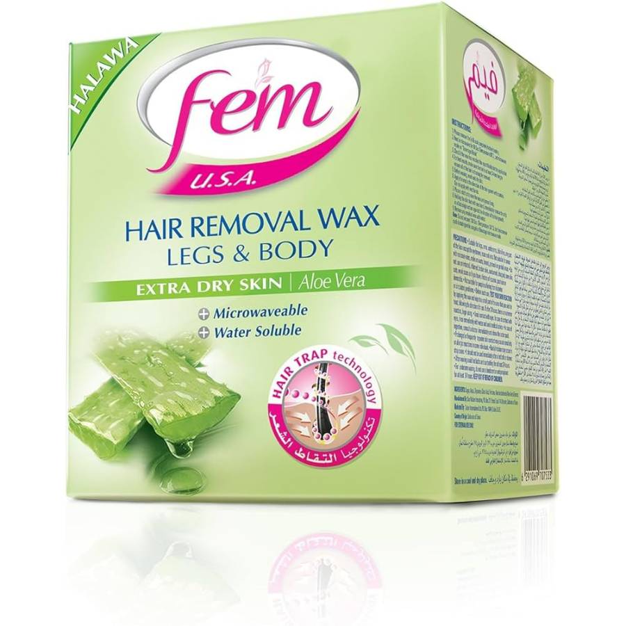 شمع إزالة الشعر Fem بخلاصة الصبار، يأتي بوزن 450 جرام. يستخدم لإزالة الشعر من الجذور، مما يوفر نعومة تدوم طويلاً. يحتوي على خلاصة الصبار لتهدئة البشرة وتقليل الاحمرار والتهيج الناتج عن عملية إزالة الشعر بالشمع.