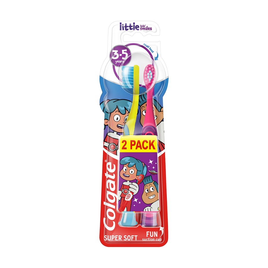 عبوة تحتوي على قطعتين من فرشاة أسنان كولجيت للأطفال من 3-5 سنوات "Little Kids Smiles". مصممة برأس صغير وشعيرات ناعمة لتناسب أفواه الأطفال الصغار. تشجعهم على تطوير عادات تنظيف صحية وتجعل تجربة التنظيف سهلة وممتعة.