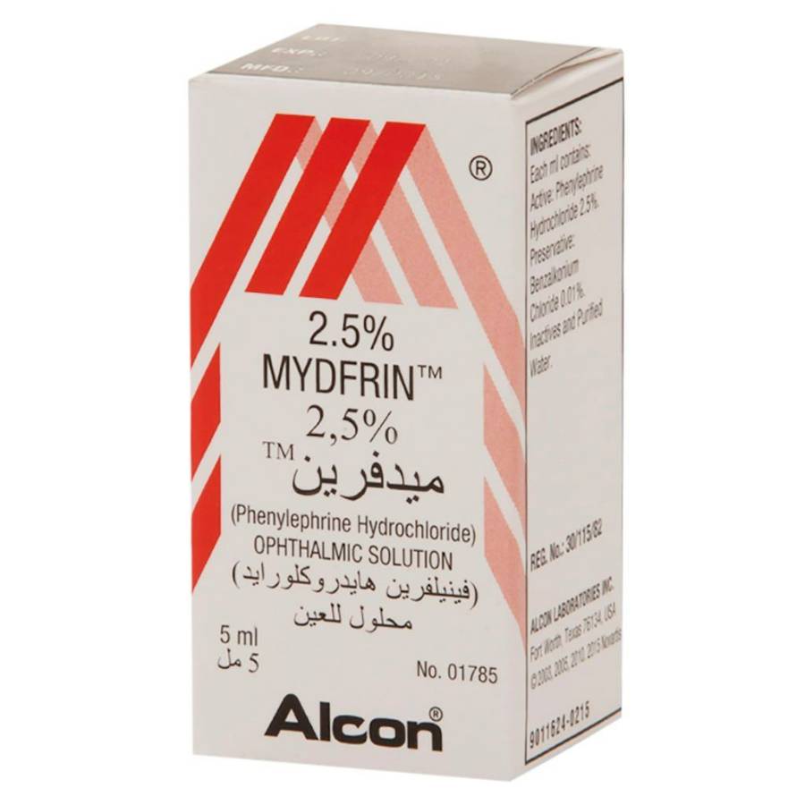 مايدفرين قطرة عين بتركيز 2.5%، تأتي في زجاجة بحجم 15 مل.