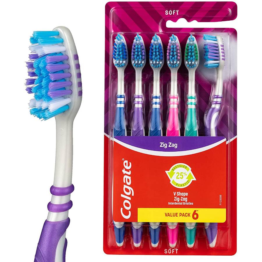فرشاة أسنان كولجيت Zig Zag بشعيرات ناعمة. تتميز بترتيب شعيرات متعرج للوصول بين الأسنان، لكن بشعيرات ناعمة لتكون لطيفة على اللثة. خيار جيد لمن يفضلون التنظيف اللطيف مع فعالية الوصول بين الأسنان.