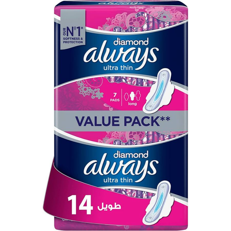 Always Ultra Diamond Long with Wings pads combine ultra thinness with long-lasting protection. Their unique diamond design helps with rapid absorption while the wings provide stability and comfort. Perfect for days when you need reliable protection with thinness.