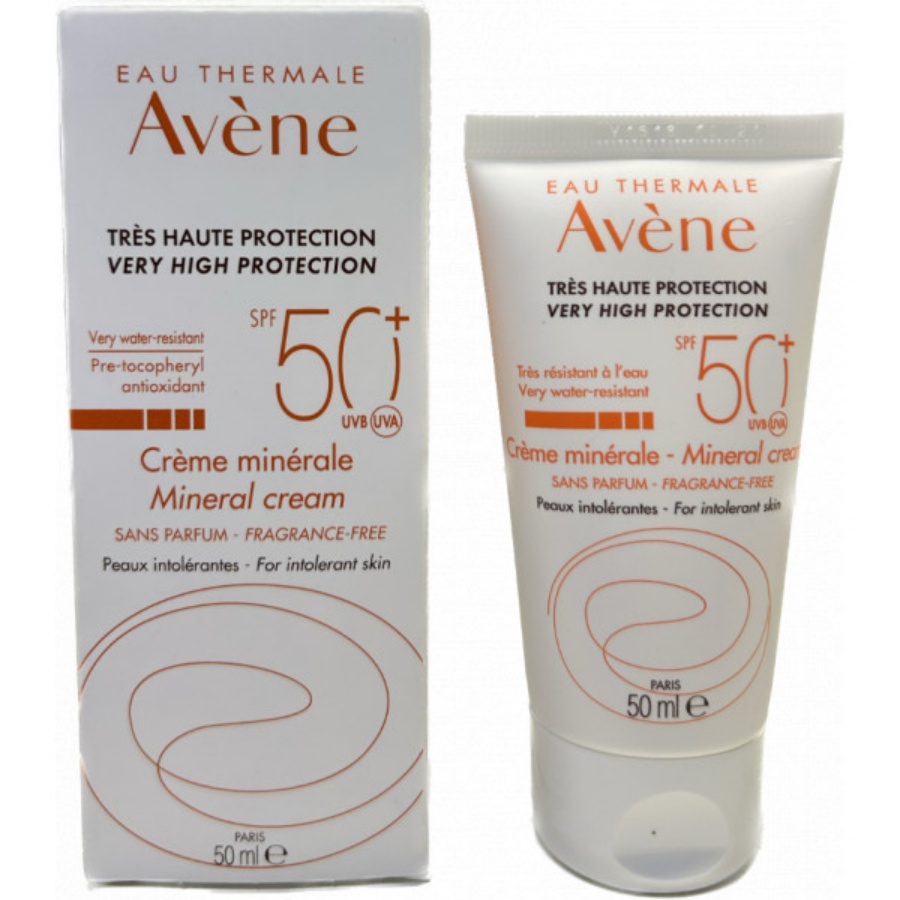 Full Description: Mineral sunscreen cream with SPF 50+ suitable for sensitive skin. Ingredients: Avène thermal water sun protection factors. Usage: Apply to skin before sun exposure. Benefits: UV protection suitable for sensitive skin.