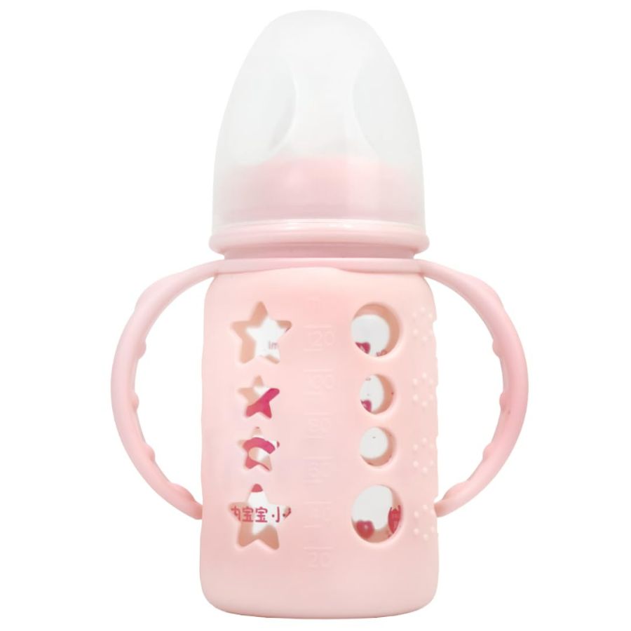 Baby Dar glass feeding bottle with a handle 120 ml capacity packaged in shrink wrap.
