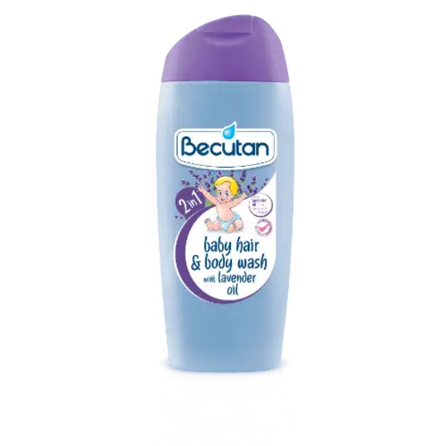 Becutan Baby Hair & Body Wash with Lavender Oil 200ml bottle.A gentle 2-in-1 cleanser for baby's bath time infused with calming Lavender Oil.Helps to relax the baby while gently cleansing skin and hair leaving a subtle lavender scent.