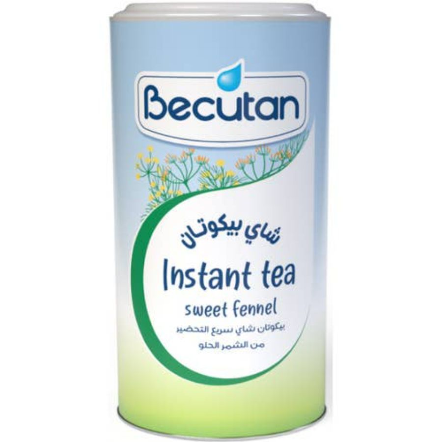 Becutan Instant Sweet Fennel Tea 200g container.An instant tea made with sweet fennel traditionally used to aid digestion and relieve colic symptoms in infants.Easy to prepare providing a gentle herbal drink suitable for babies (confirm age suitability).