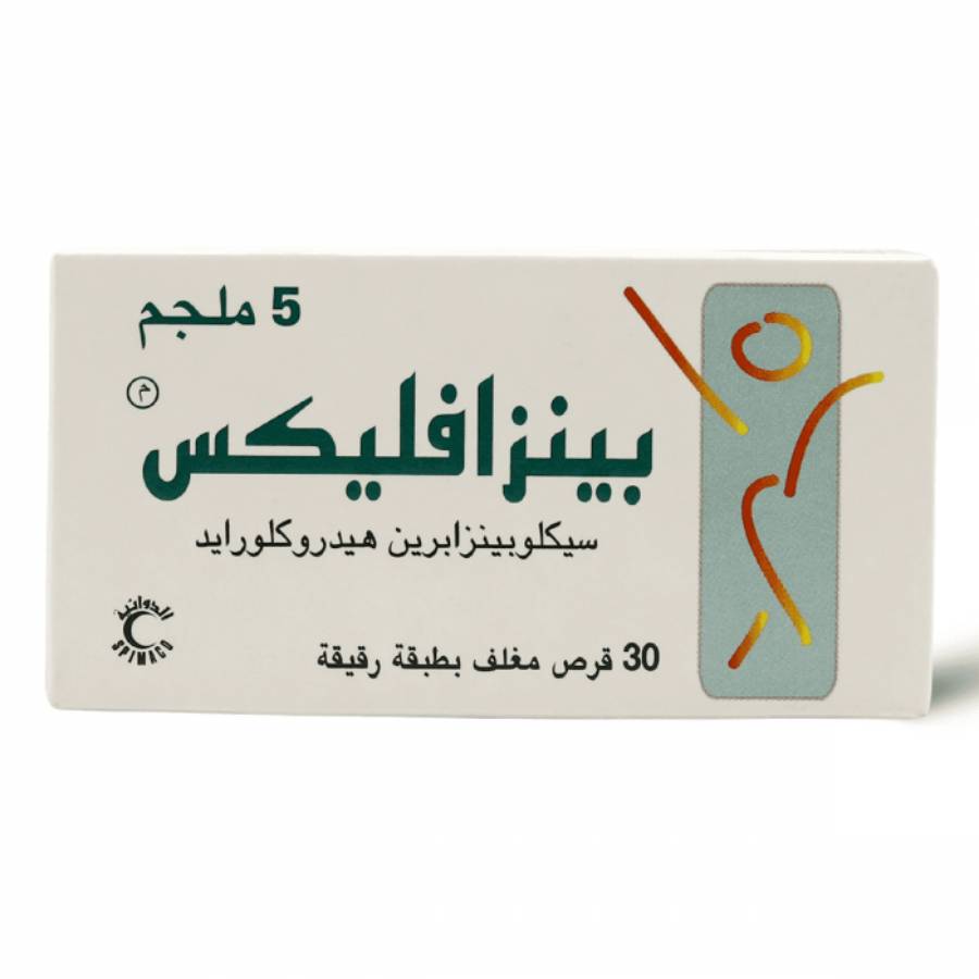 BENZAFLEX likely contains Cyclobenzaprine used as a muscle relaxant. It is typically used as an adjunct to rest and physical therapy. This product comes as 5 mg tablets supplied in a package of 30 tablets.