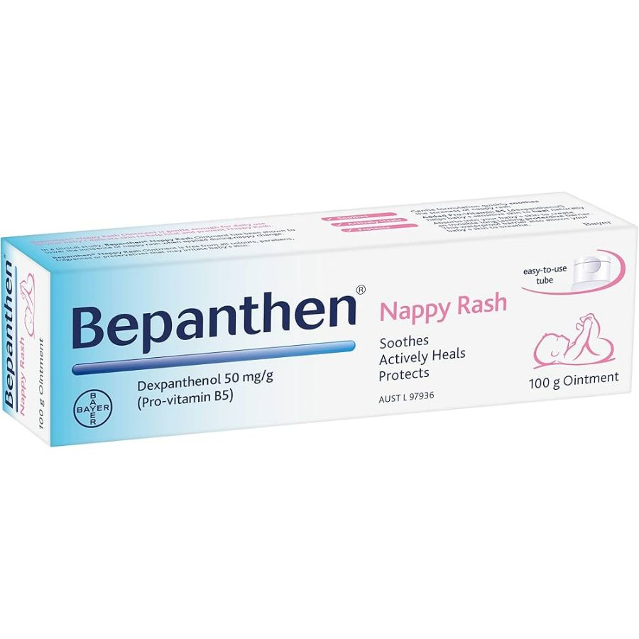 BEPANTHEN Nappy Care Ointment 100g tube. Forms a protective barrier on baby's skin to help prevent and soothe nappy rash. Contains Pro-vitamin B5 to support skin healing.