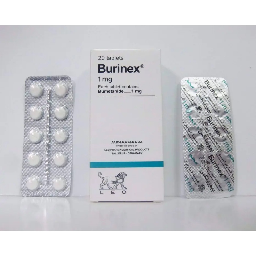 BURINEX 1MG 20TAB is a pharmaceutical medication likely a diuretic containing bumetanide. It is in tablet form with each tablet containing 1 milligram of the active ingredient. The package contains 20 tablets used to help the body get rid of excess fluid.