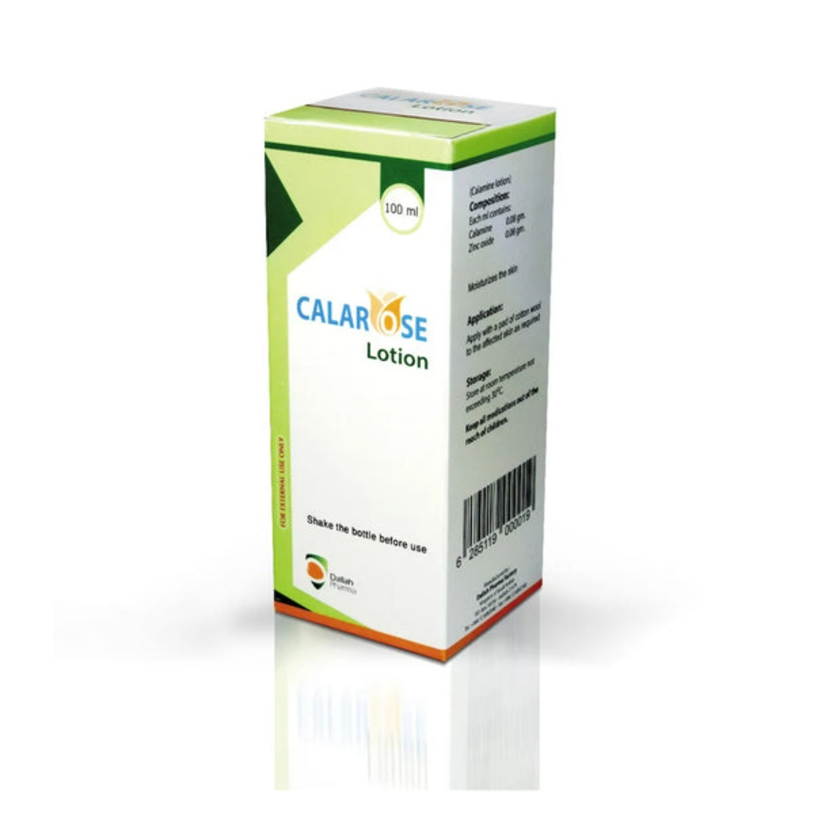 CALAROSE LOTION 100 ML is a topical skin lotion. Based on the name it likely contains calamine a common ingredient for soothing itchy or irritated skin. The product comes in a 100-milliliter bottle intended for external application.