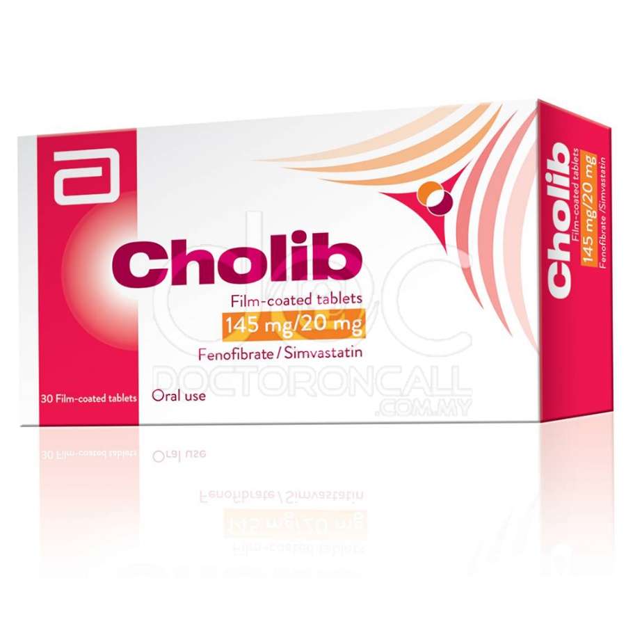 CHOLIB 145/20 MG 30 COATED TAB is a combination medication in coated tablet form. It contains two active ingredients at strengths 145 milligrams and 20 milligrams per tablet. The package contains 30 tablets likely used for managing cholesterol or lipids.