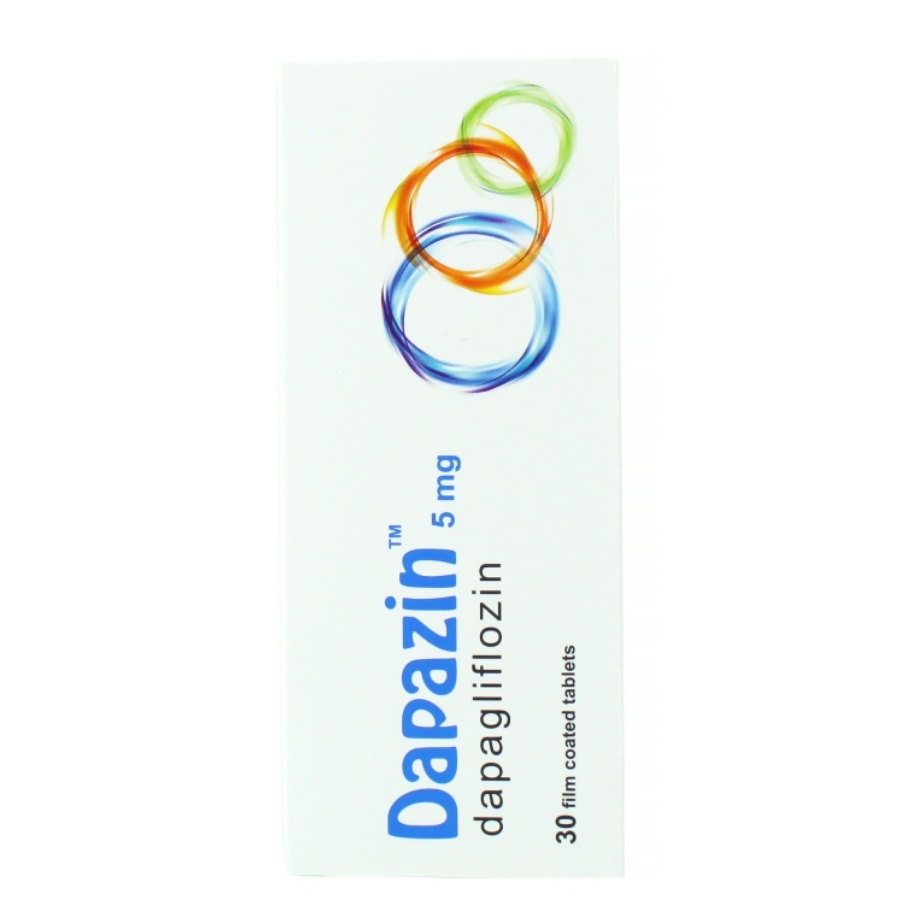 DAPAZIN 5 MG 30 TAB is a medication in tablet form likely containing Dapagliflozin. Dapagliflozin is an SGLT2 inhibitor used to treat type 2 diabetes heart failure and chronic kidney disease by helping the kidneys excrete glucose. This package contains 30 tablets for daily oral administration.