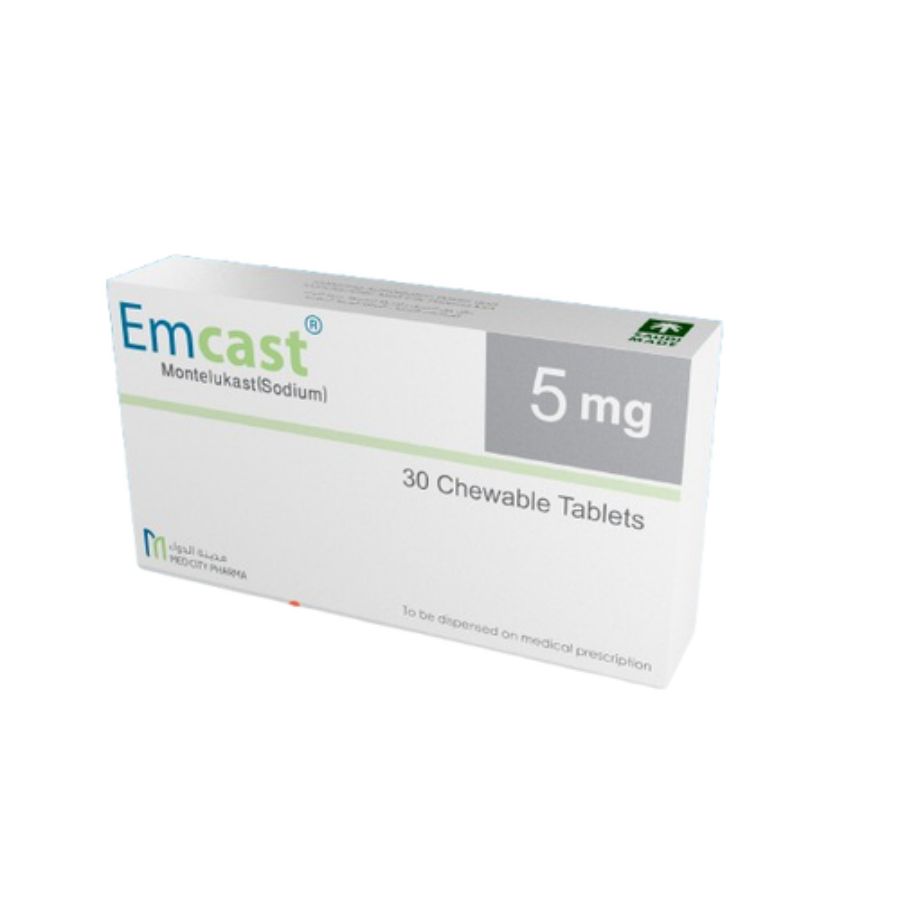 EMCAST 5 MG 30 TAB contains montelukast commonly prescribed for children aged 6-14 years to prevent asthma symptoms and treat allergic rhinitis. This strength is typically in chewable tablet form. The package contains 30 tablets.