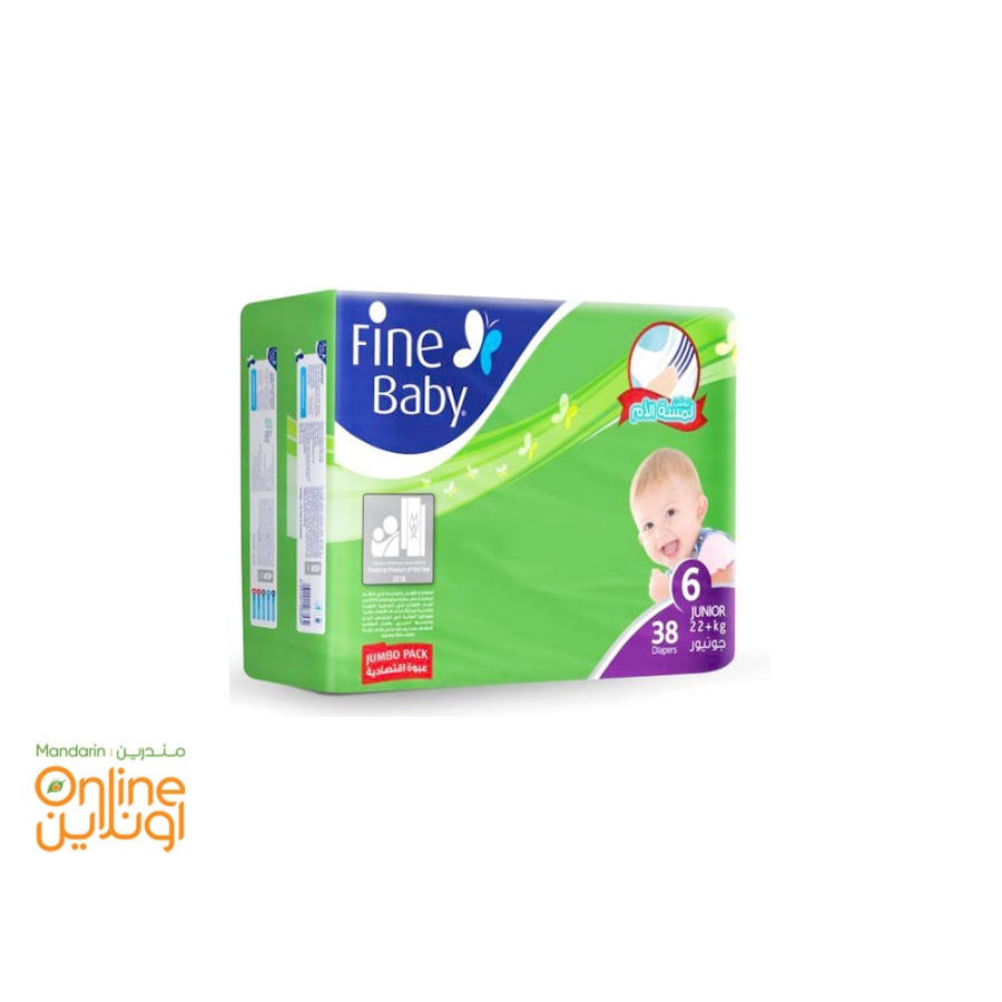 Fine Baby Diapers Jumbo Pack Size 6 (Junior). This value pack includes 3 individual packs with 38 diapers each totaling 114 pieces. Designed for older babies offering great absorbency and comfort throughout the day and night.