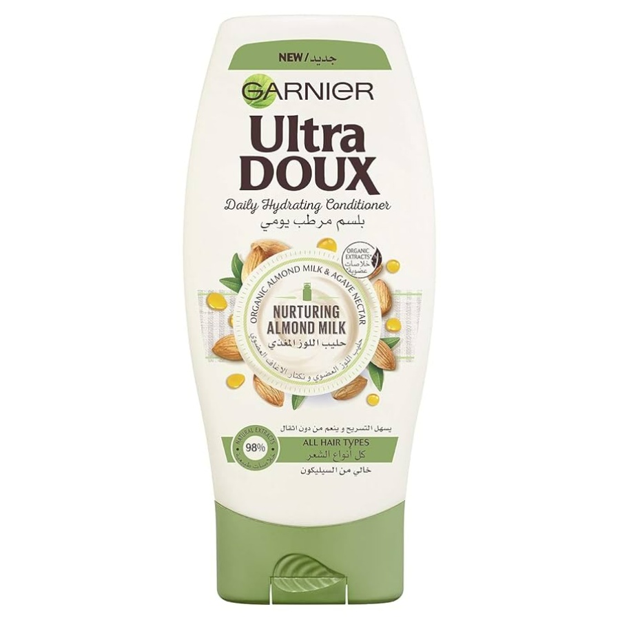 Garnier Ultra Doux Daily Moisture Conditioner with Nourishing Almond Milk - 400ml Garnier Ultra Doux Nourishing Almond Milk Conditioner contains organic almond milk a true nutritional treasure to moisturize hair without weighing it down and organic agave nectar a light and healthy nectar known for its revitalizing properties. For daily nourishment of your hair: Nourishing almond milk Introducing our new healthy creamy silicone-free recipe designed for all hair types Ultra Doux combines two healthy ingredients: Organic Almond Milk and Organic Agave Nectar Discover a complete skincare routine made with 98% natural ingredients and free of parabens and silicones. Vegan recipe for all hair types the components: Water Cetearyl Alcohol Glyceryl Stearate Glycerin Isopropyl Myristate Stearamidopropyl Dimethyl Taurate Glycine Soja Oil/Soybean Oil Prunus Amygdalus Dulcis Seed Extract/Sweet Almond Seed Extract Agave Tequilana Leaf Extract Aloe Barbadensis Leaf Juice Sodium Hydroxide Helianthus Annuus Seed Oil/Sunflower Seed Oil Coco-Caprylate/Capate Hydroxypropyl Guar Hydroxypropyl Zirconium Chloride Caprylyl Glycol Citric Acid Xanthan Gum Tartaric Acid Cetyl Esters Potassium Sorbate Sodium Benzoate Salicylic Acid Dehydroacetic Acid Linalool Fragrance/Parfum. How to use: After shampooing apply all over hair to ends and massage gently. Leave it on for a few moments and then wash it off with water. For best results follow with Garnier Ultra Doux Almond Milk Leave-In Conditioner.