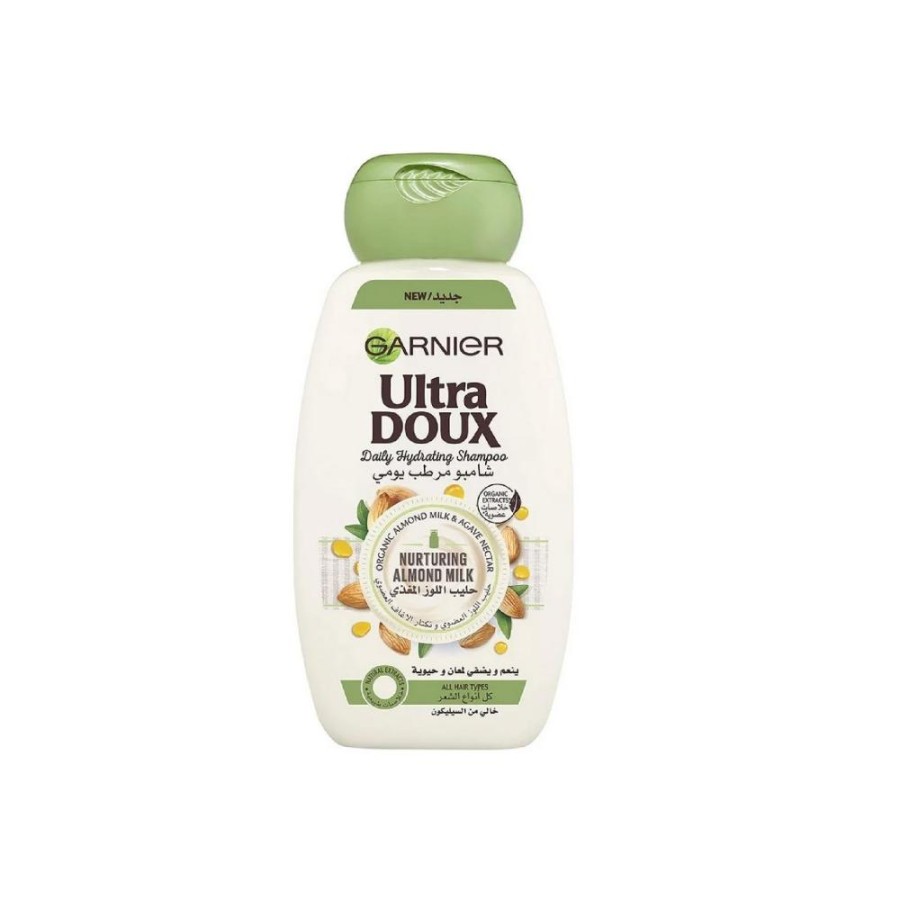 Garnier Ultra Doux Nourishing Almond Milk Shampoo is enriched with organic almond milk a true treasure of nutrition to moisturize hair without damaging it and organic agave nectar a light and healthy nectar known for its revitalizing properties. Product Information Garnier Ultra Doux Nourishing Almond Milk Shampoo is enriched with organic almond milk a true treasure of nutrition to moisturize hair without damaging it and organic agave nectar a light and healthy nectar known for its revitalizing properties. Instructions: Apply a small amount of shampoo to wet hair massage well to help stimulate the scalp then rinse. For best results use with Nourishing Almond Milk Conditioner and Leave-in Milk Conditioner.