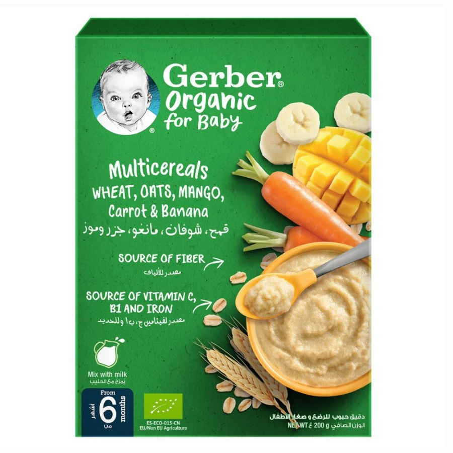 Gerber Organic Cereal with Wheat Oats and Mango is a nutritious first food for babies from 6 months. This 200g pack combines healthy grains with the sweet taste of mango. It's an easy-to-prepare cereal to support your baby's growth and development.