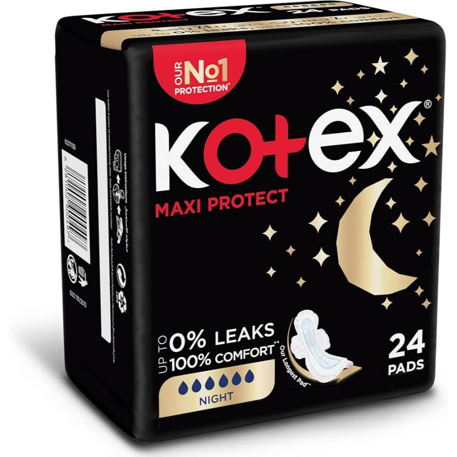 KOTEX MAXI NIGHTTIME pads a large economical package (6 packs x 24 pads = 144 pads).