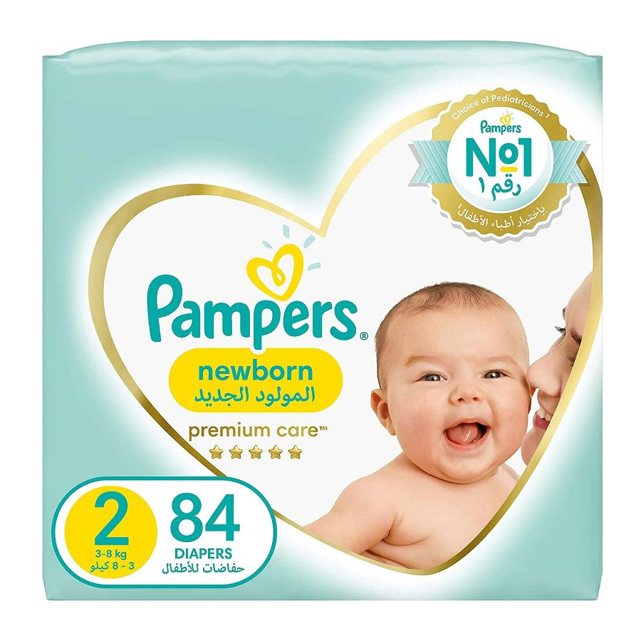 Description: Pampers Premium Care size 2 in a jumbo pack suitable for children weighing 3-8 kg. The package contains 2 bags each with 84 diapers. Features: Designed for babies' delicate skin. Provides long-lasting leak protection. Soft and breathable material. Usage: Place the diaper with the adhesive tapes in the front then secure it comfortably.
