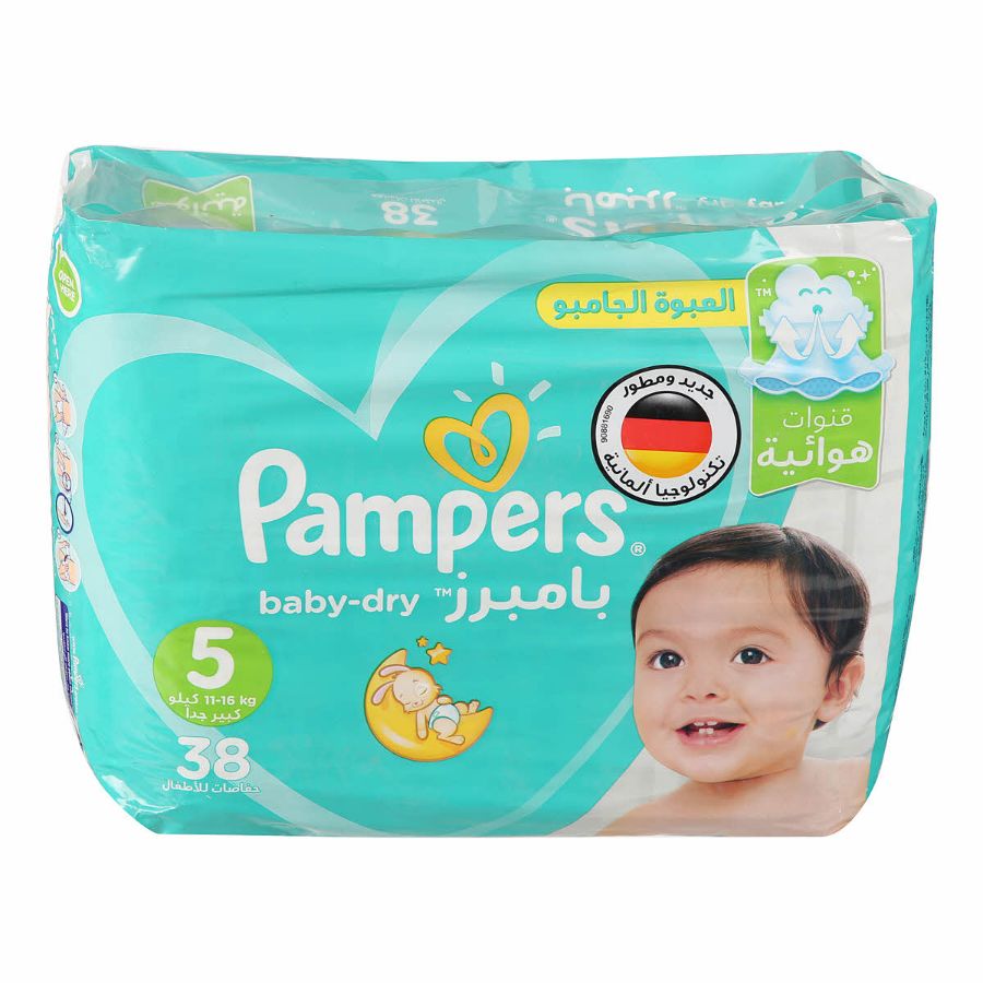 Description: Pampers size 5 Large suitable for children weighing 11-25 kg. The package contains 3 bags each with 38 diapers. Features: Economical and suitable for daily use. Provides leak protection. Soft on the baby's skin. Usage: Place the diaper with the adhesive tapes in the front then secure it comfortably.