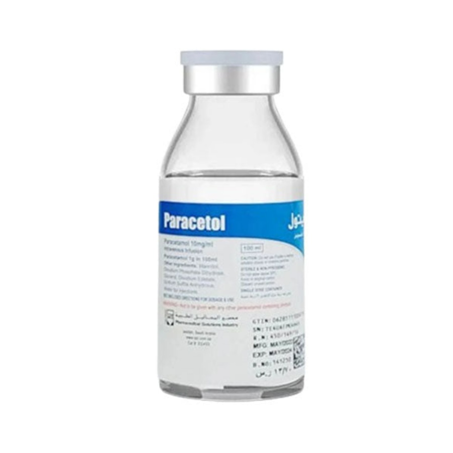 Paracetol solution for intravenous infusion at a concentration of 10mg/ml. Used for pain relief and reducing fever in appropriate medical situations. Comes in a 100ml volume for IV administration. Intended for clinical use.