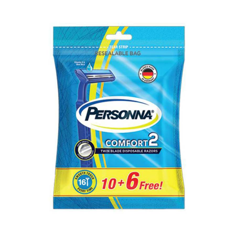 Persona Comfort 2 Men's Razor Blades. The pack contains 10 blades plus 6 extra pieces. Provide a comfortable and smooth shave. Designed for closeness and comfort.