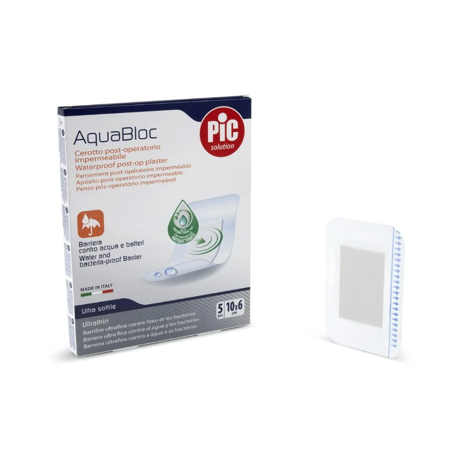 PIC Aquabloc Antibacterial Waterproof Plaster measuring 10 cm x 6 cm. Used to cover medium-sized wounds lengthwise or widthwise. Provides reliable protection against water and germs. Flexible and durable for active use.