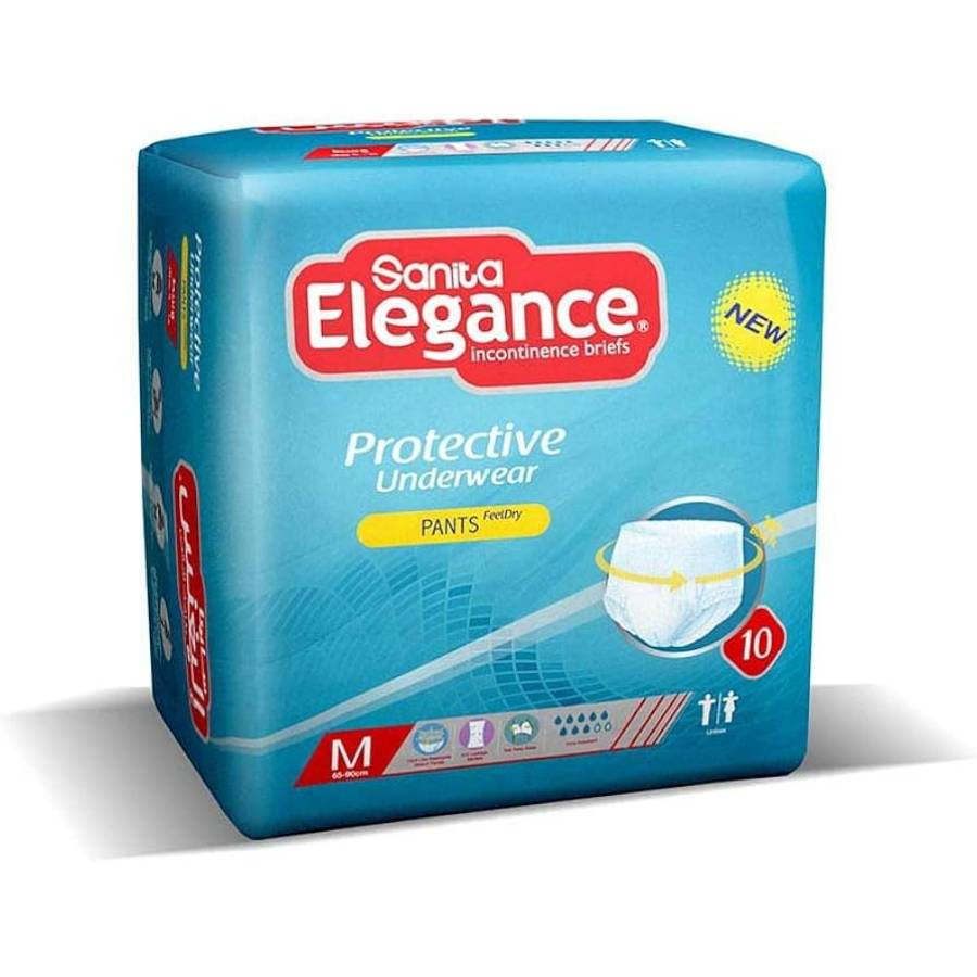 Sanita Elegance Adult Diaper Pants size M (Medium) come in a pack containing 4 bags with each bag containing 10 pants (total 40 pants). These pants provide a suitable solution for daily protection with ease of wearing and comfort. They are designed for effective absorption and keeping dry.