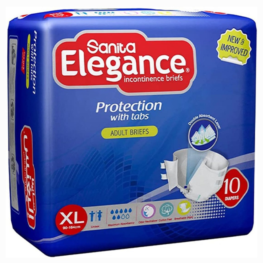 Sanita Elegance Adult Diapers size XL (Extra Large) come in a pack containing 4 bags with each bag containing 10 diapers (total 40 diapers). These diapers are designed to provide maximum protection and absorbency for individuals requiring an extra-large size. They offer comfort and confidence to the wearer.