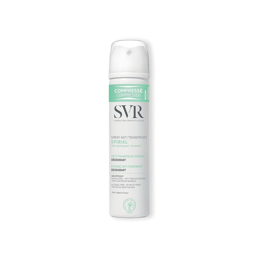 Description: SVR Spirial Anti-Transpirant Spray is designed to control sweat. How to Use: Spray a small amount on the underarm area. Benefits: - Controls sweat. - Long-lasting. - Suitable for daily use.